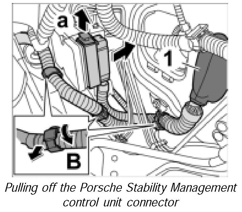 1. Release the Porsche Stability Management control unit connector -arrow a- and pull off.