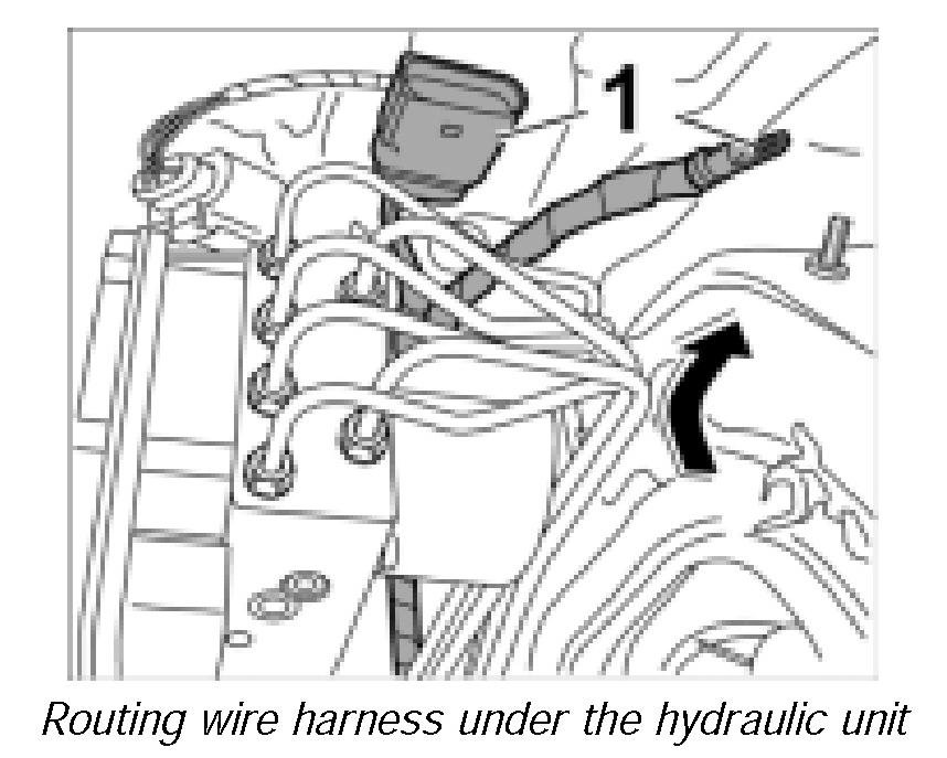 29. Route wire harness -1- under the hydraulic unit.