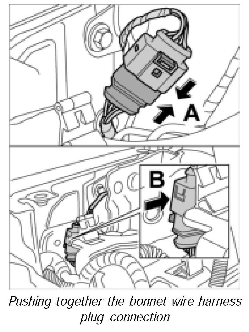 32. Push the plug connection for the bonnet wire harness onto the retaining clips -arrow B- until it is felt to engage.