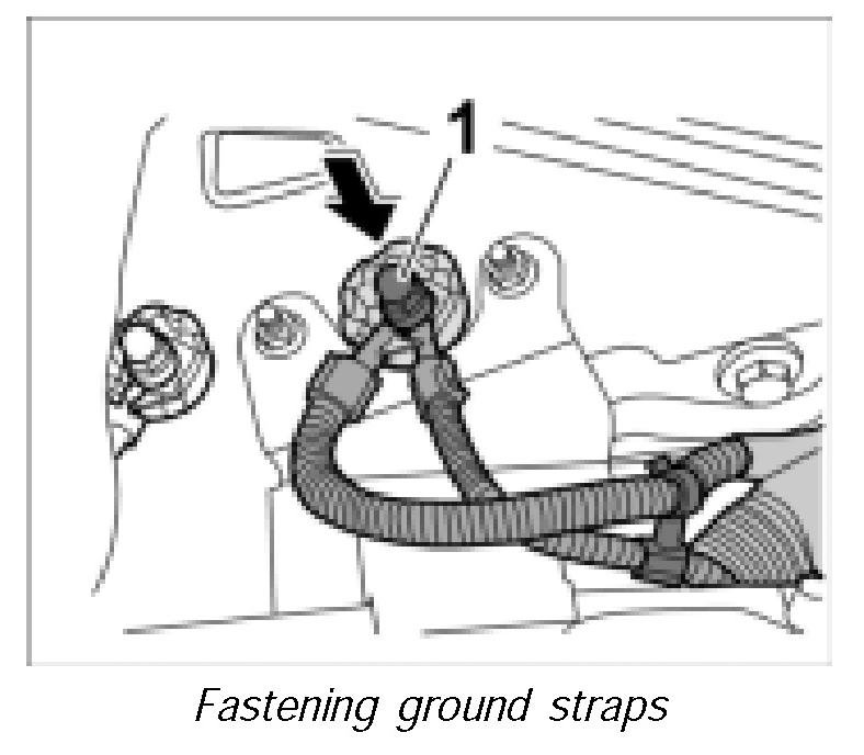 3. Mount ground straps together with the twist lock on the stud and screw down with the fastening nut -1-. Tightening torque 6.5 ftlb.