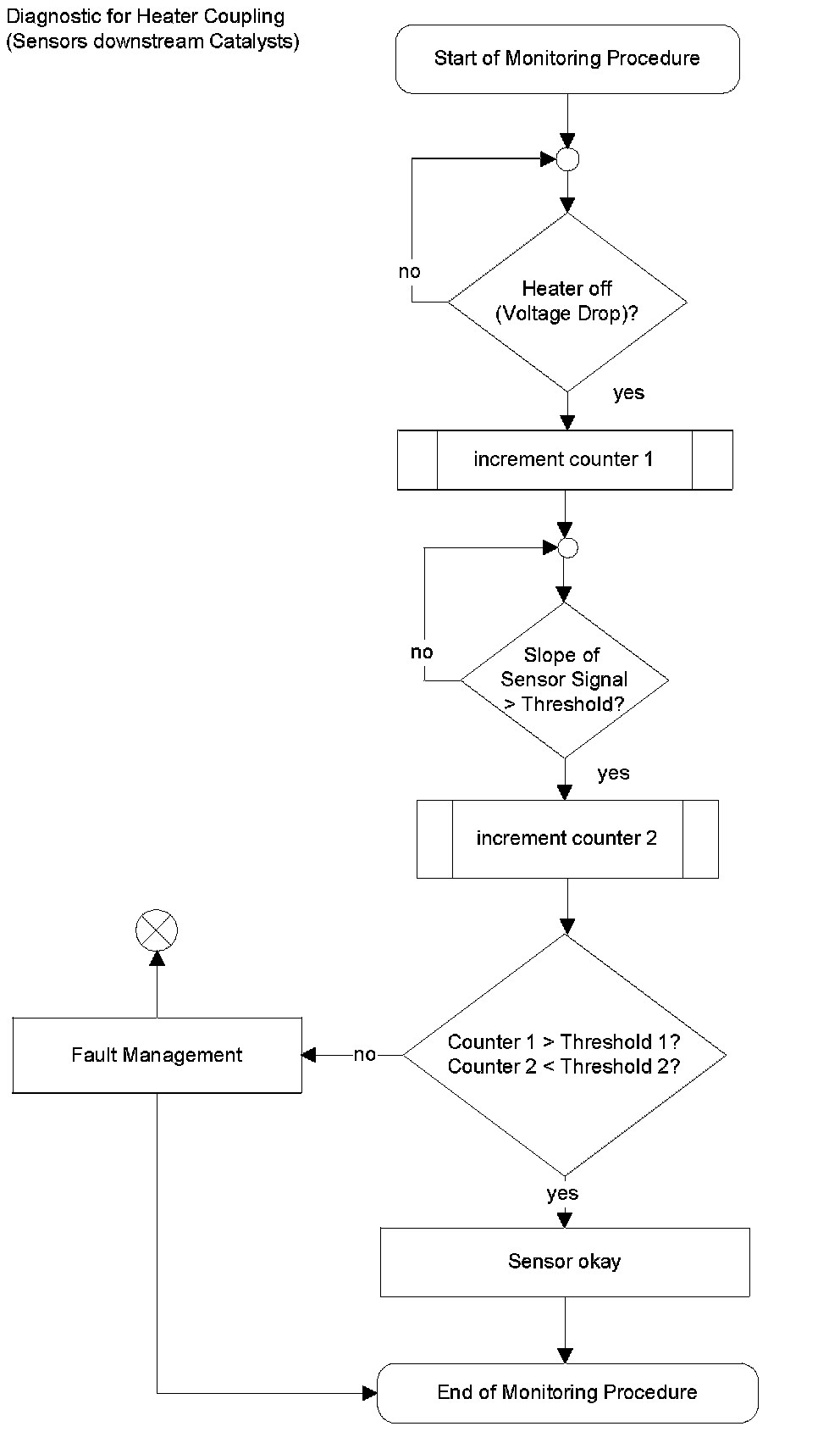 The Lambda value of oxygen sensor upstream catalyst is compared to the sensor voltage downstream catalyst. Additionally, a hardware check is performed by checking the sensor voltage range. Three diagnostics paths covers the air fuel ratio range of Lambda value (e.g. Lambda=1, lean, rich). A corresponding reaction of sensor voltage downstream catalyst is expected.