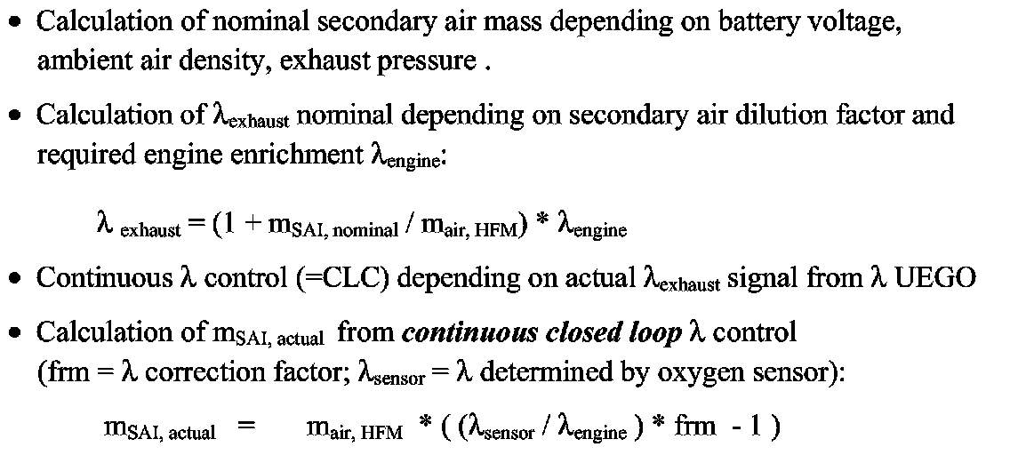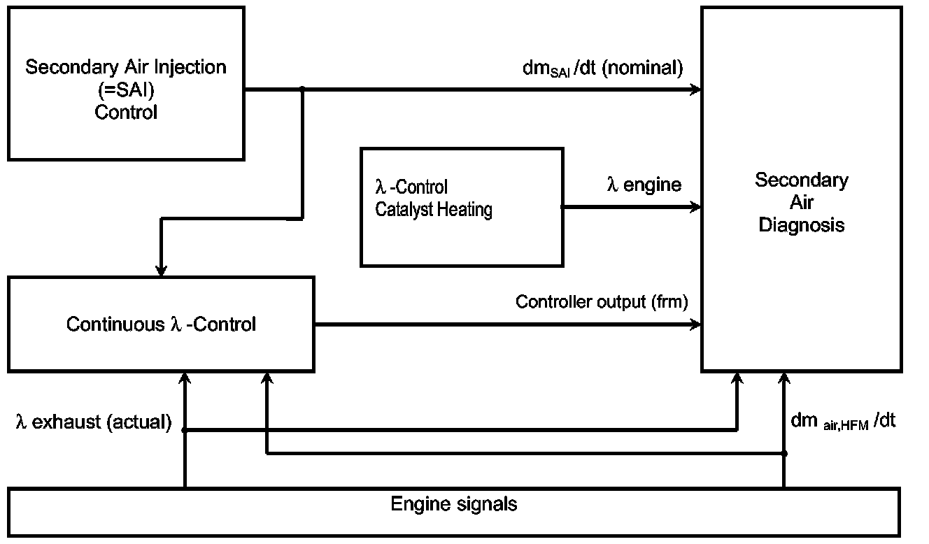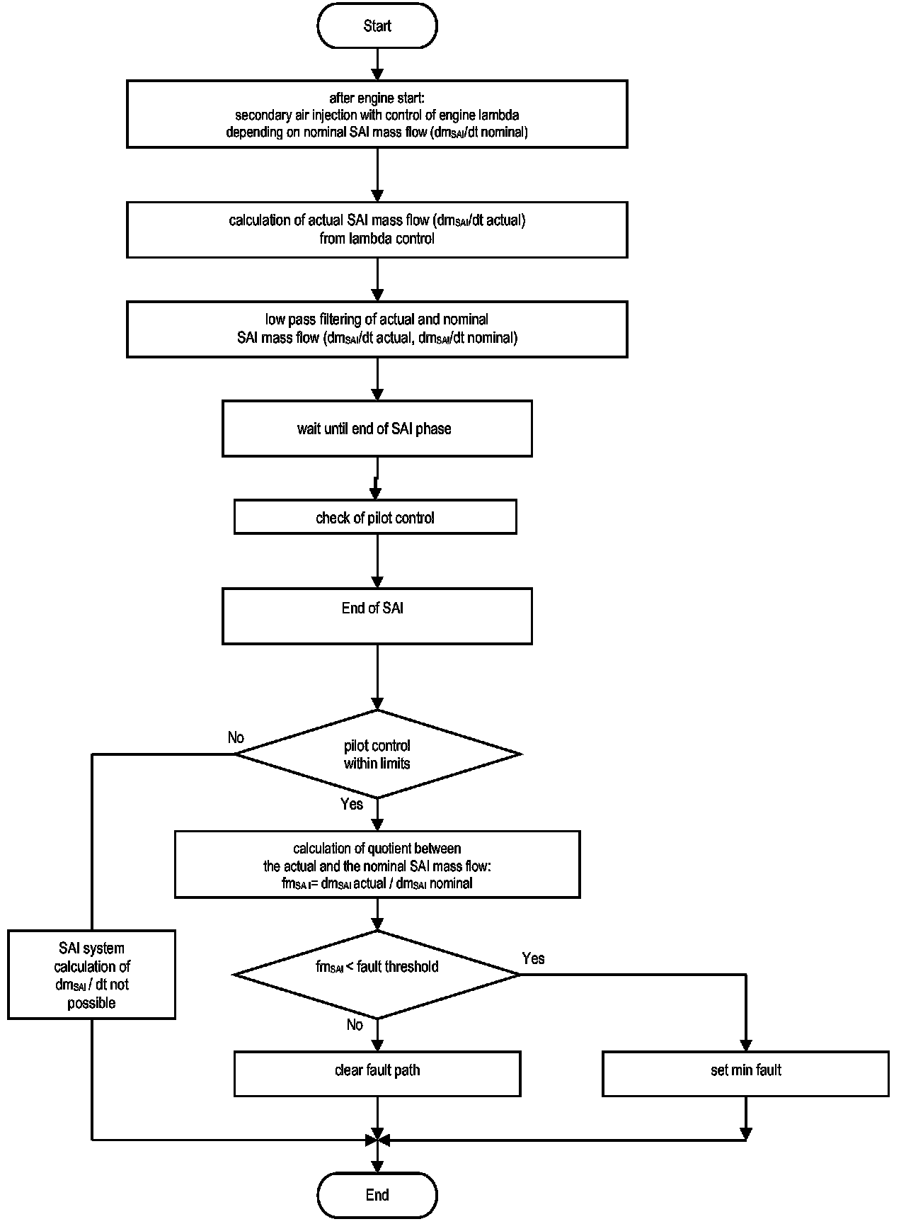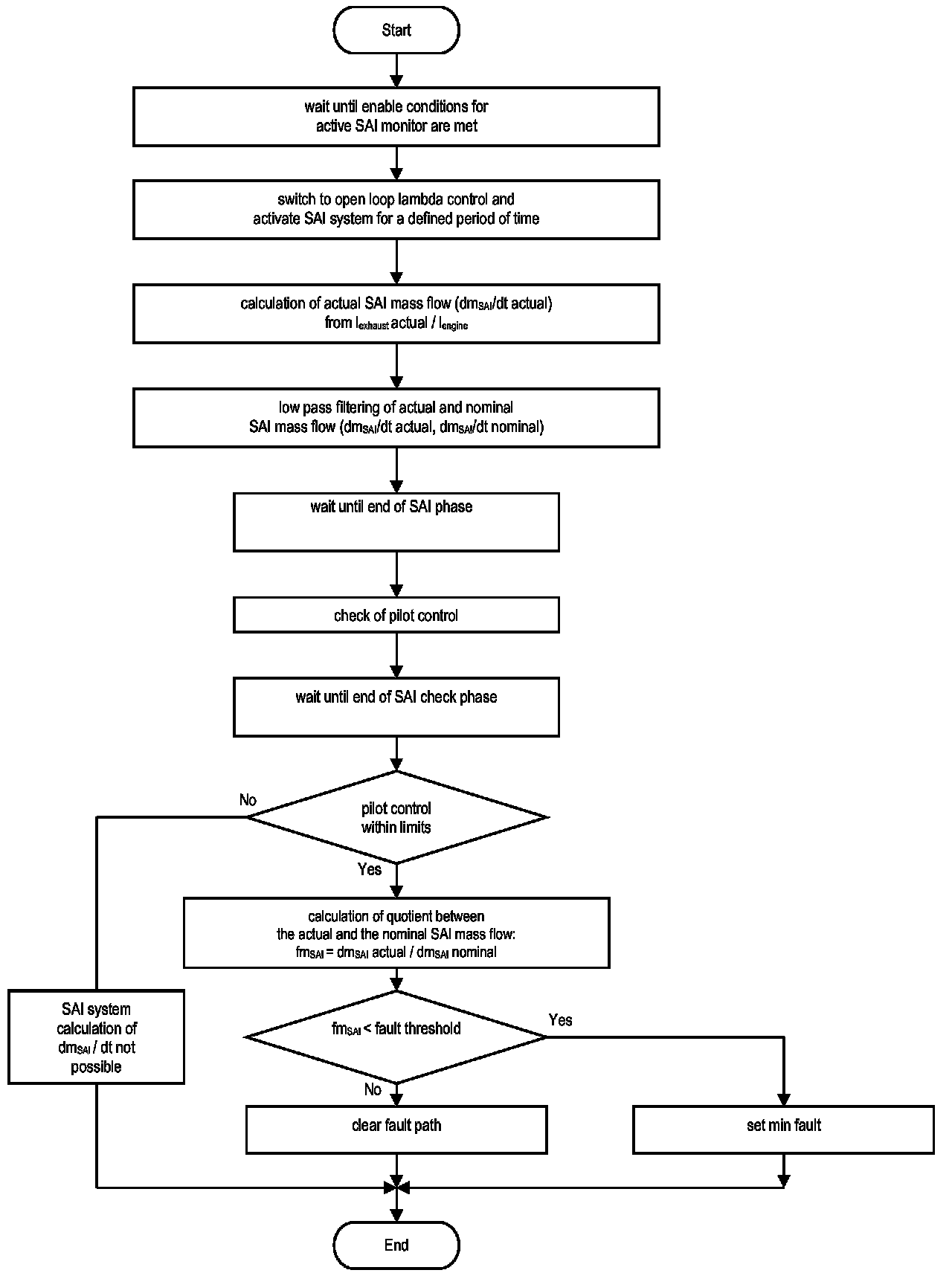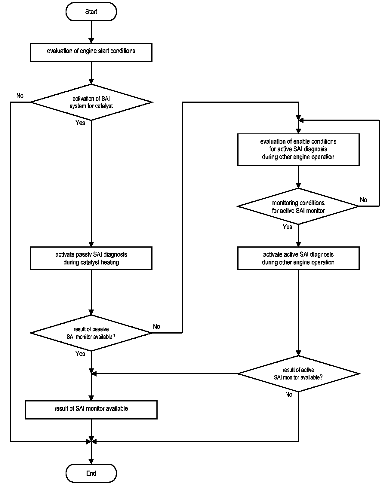 The SAI monitor includes a passive and an active check. The checks are performed with different monitoring conditions. The passive SAI monitor observes the calculated secondary air mass flow after engine start and catalyst heating. If this value is in between certain thresholds the SAI will work properly. The active SAI monitor is performed mainly during engine idle if a result of the passive SAI monitor was not available. The SAI monitor observes the calculated secondary air mass flow. If this value is in between certain thresholds the SAI will work properly.
