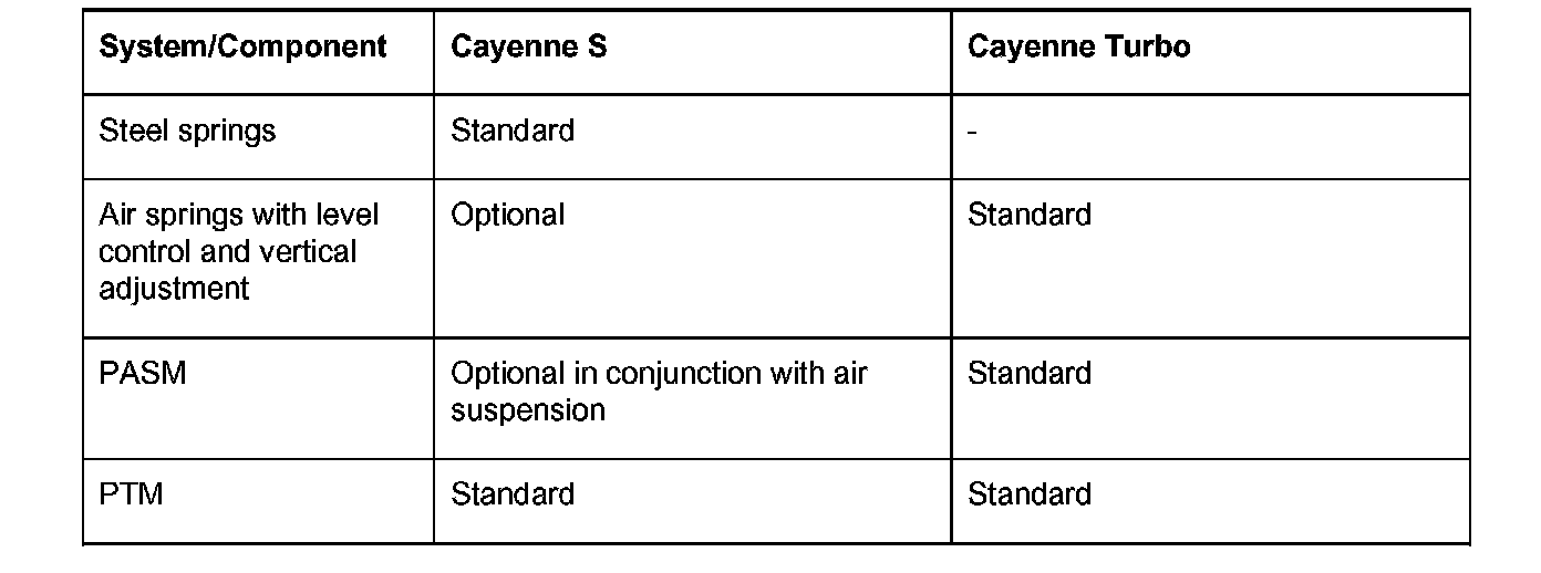 ^ Level control system with full-supporting air suspension on both axles and electronically regulated shock absorbers (standard for Cayenne Turbo, optional for Cayenne S)