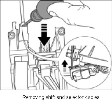 5. Pull shift and selector cable off gearshift bracket. To do this, release the fastening parts using a screwdriver -arrows-.