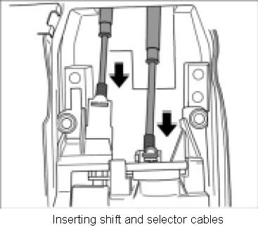 1. Install top section of gearshift bracket. Insert shift and selector cable into fastening part -arrows-.