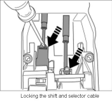 3. Lock shift and selector cable by pressing on the fastening parts -arrows-.
