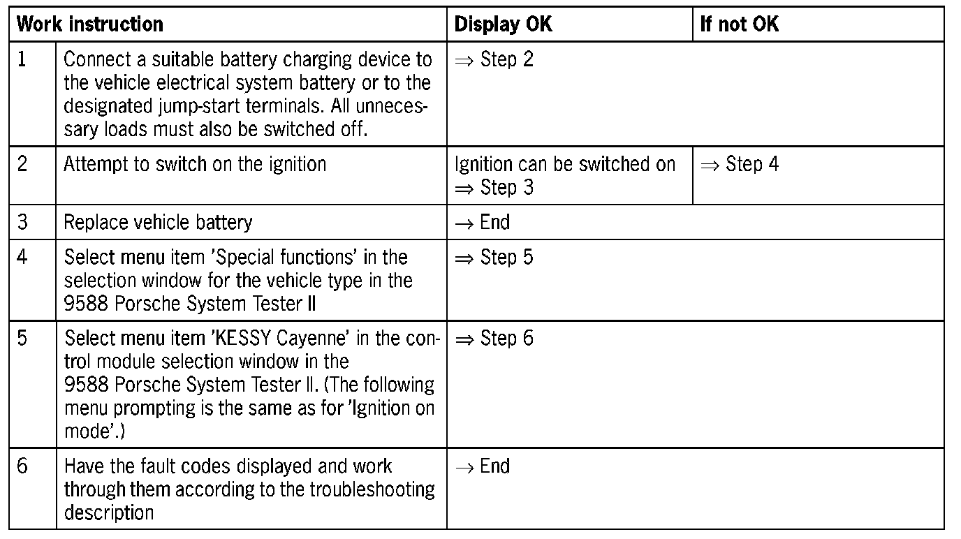 - The basic equipment of the Cayenne includes the immobiliser control module. The Porsche Entry & Drive (KESSY) function can also be integrated into the immobiliser control module. In fact, the assembly of both control modules is identical, but the Serv. Nos. are different (immobiliser control module: Serv. No. 9668 and KESSY control module: Serv. No. 9666). The diagnosis/troubleshooting provided here can be applied to both the immobiliser system and the KESSY system. The difference, from the point of view of diagnostics, is that the fault codes 0179, 0180, 0181, 0182, 0183, 0190, 0191, 0192 and 0193 cannot occur for the immobiliser control module. In addition, various menu and selection functions in the 9588 Porsche System Tester II are not used. In the component arrangement, the following components are omitted for the basic immobiliser: front left door antenna, front right door antenna, rear left door antenna, rear right door antenna, front left door sensor, front right door sensor, rear left door sensor, rear right door sensor, antennas on end of centre console, antenna on switching slot cover, loadspace antenna and the antennas on the rear bumper.