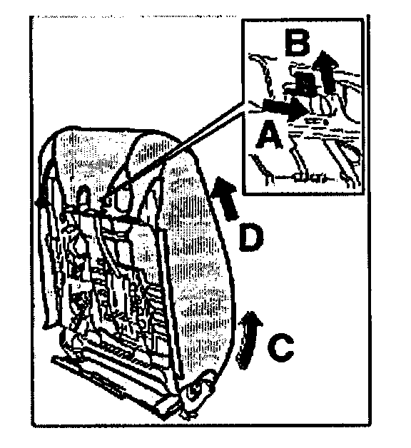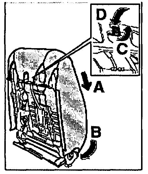 3. Pull rubber band back back -Arrow C- and engage on backrest frame -Arrow D-.