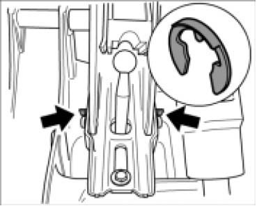 10. Loosen the two upward running struts of the articulated strut and let them hang. To do this, remove the retainer on each retaining pin, remove the retaining pins, and let the struts hang down.