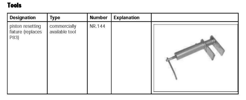 1. Push brake pad back slightly and evenly with piston resetting fixture (replaces P83) NR.144, -direction arrow-.