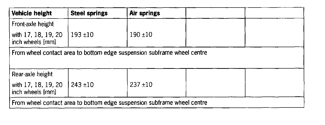 ^ If suspension alignment must be carried out on a vehicle within the first 200 km, e.g. following repairs arising from an accident, the "adjustment values" must be used for tracking. The tracking must be adjusted to the upper tolerance limit on the rear and front axle.