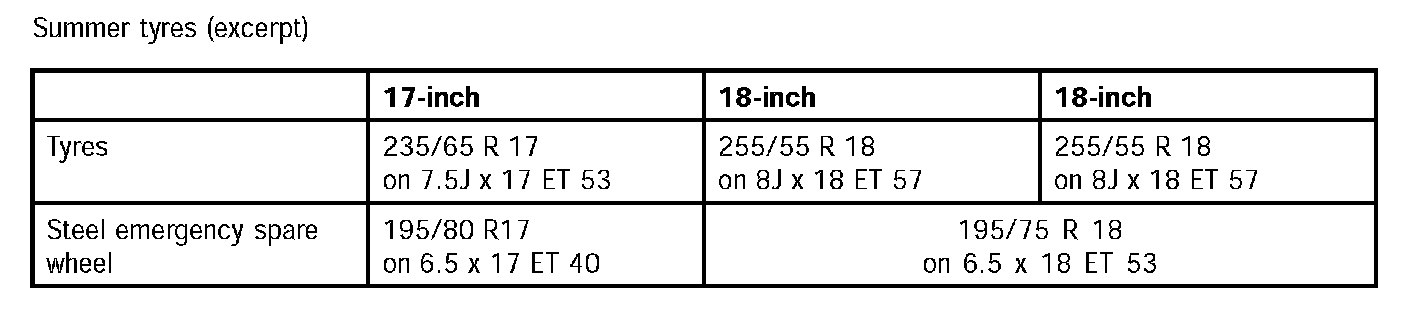 ^ The chart of tires and wheels for summer and winter should be taken from Technical Information (TI) Group 4.