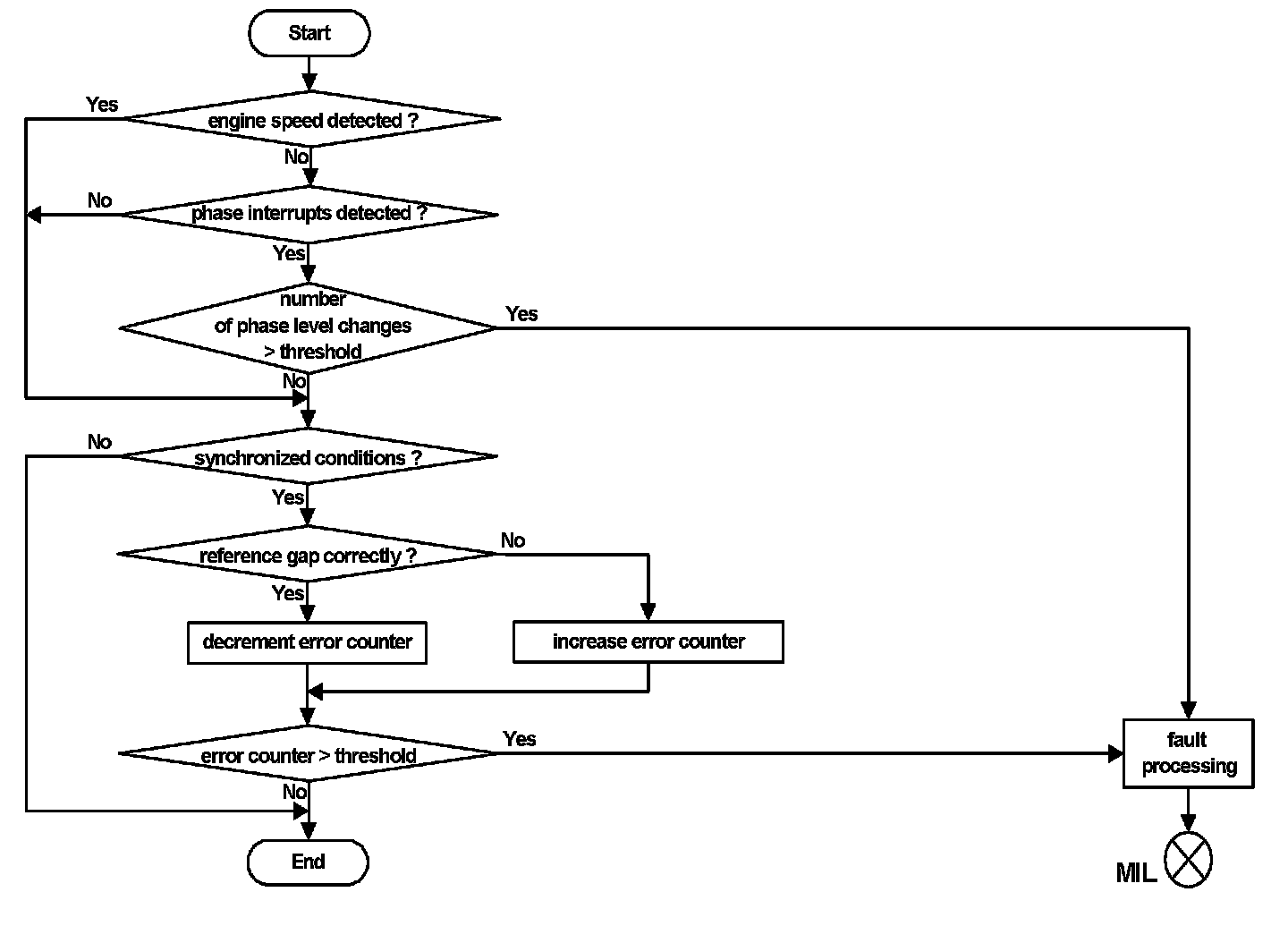 Under normal operating conditions, the flywheel position reference gap is monitored. At a loss of synchronization (more than one tooth difference between expected and observed gap position), the error counter is increased. If the gap is determined correctly the error counter is decreased. As soon as the error counter reaches a certain threshold an engine speed sensor malfunction is detected.