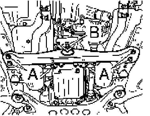 ^ Unscrew two transmission cross member screws -B- on transfer box holder.
