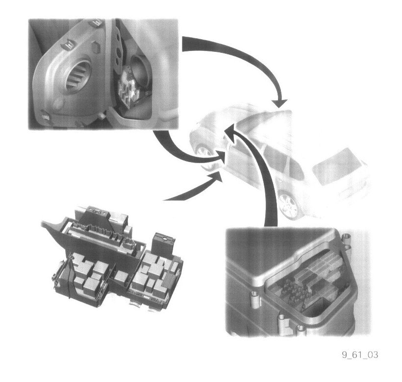 The circuitry of the vehicle electrical system is similar to that of the sports cars. Separating the electrical system areas provides good protection against mutual interference and shorts in the individual power circuits.