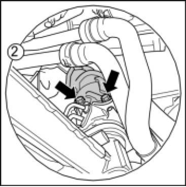 8. For easier removal of the steering gear, loosen the fastening nut on the coolant hoses. Then unclip coolant hoses from brackets and lay them upwards -see figure- (cut-away view of steering gear shown here).