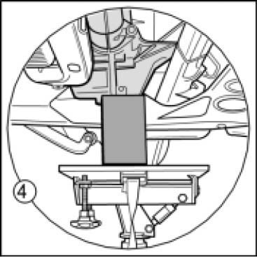 4. Release rear mount of front-axle drive (right-hand side of vehicle). Lift front axle drive with a suitable jack -see figure-(use wooden block or rubber base to prevent slipping. Remove fastening screw and lift front-axle final drive just enough to access the bearing eye above the bolting point of the front axle carrier (do not press the cardan shaft into the stop).