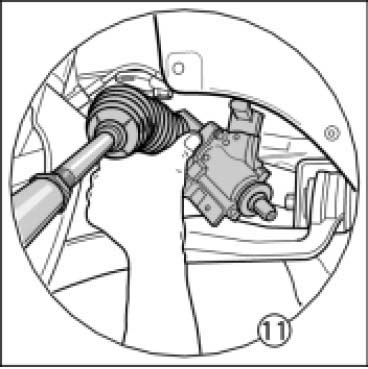 11. Unclip the coolant hoses in the wheel housing from the retaining clip. Then carefully guide out steering gear -see figure- through the left wheel housing.