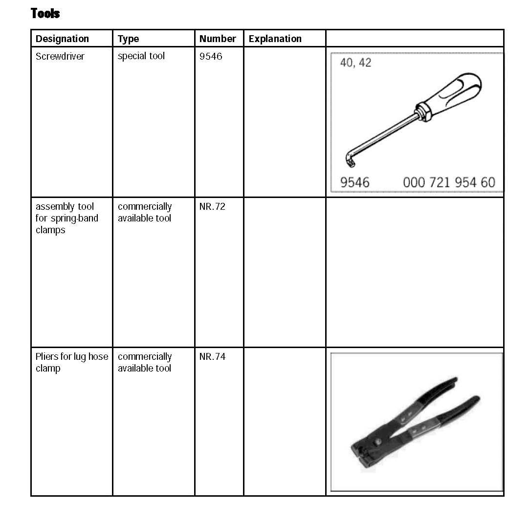 When fitting the large clamps, it is essential to observe the following installation position (right/left). The clamps must be fitted in the correct position. Place the pliers for lug hose clamp NR.74 on the clamping washer lug and lightly clamp. It should still be possible to easily turn the clamps. Check the position of the clamp once more, correcting if necessary, and then compress the clamp lug fully.
