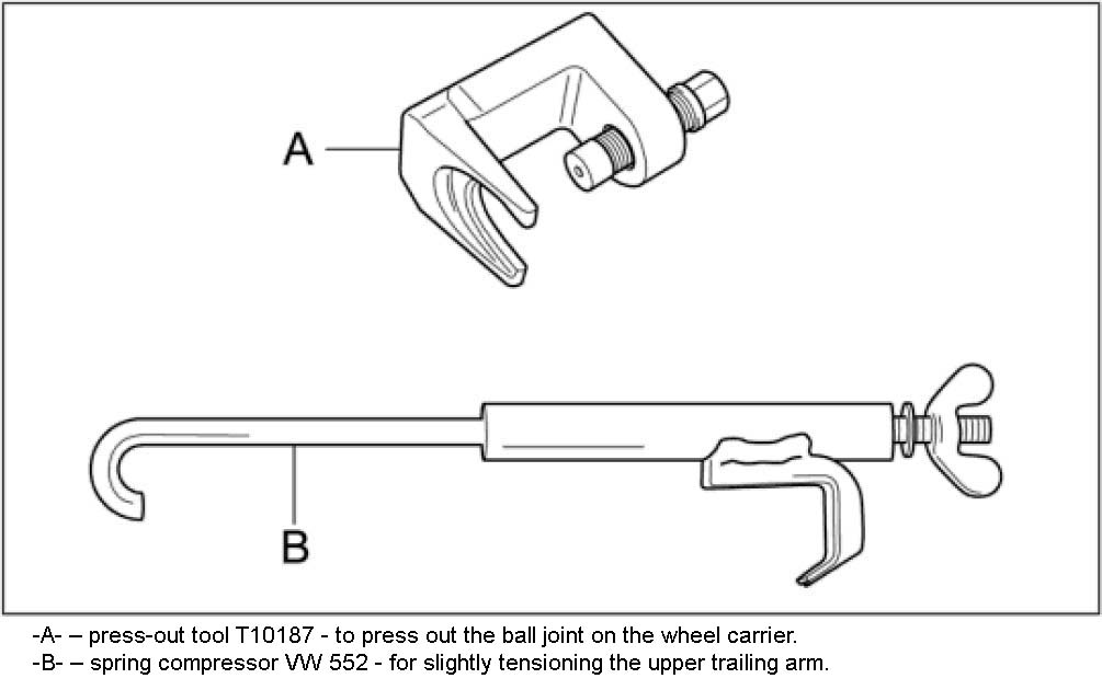 3. Loosen the fastening nuts - from the bottom ball joint and press off with the press-out tool T10187. When doing this, leave fastening nut flush on ball journal, so as not to damage thread.