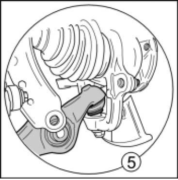 7. Remove fastening nut -Inset 5- from ball joint. Tilt -trailing armdown all the way and pull ball joint carefully out of the wheel carrier.