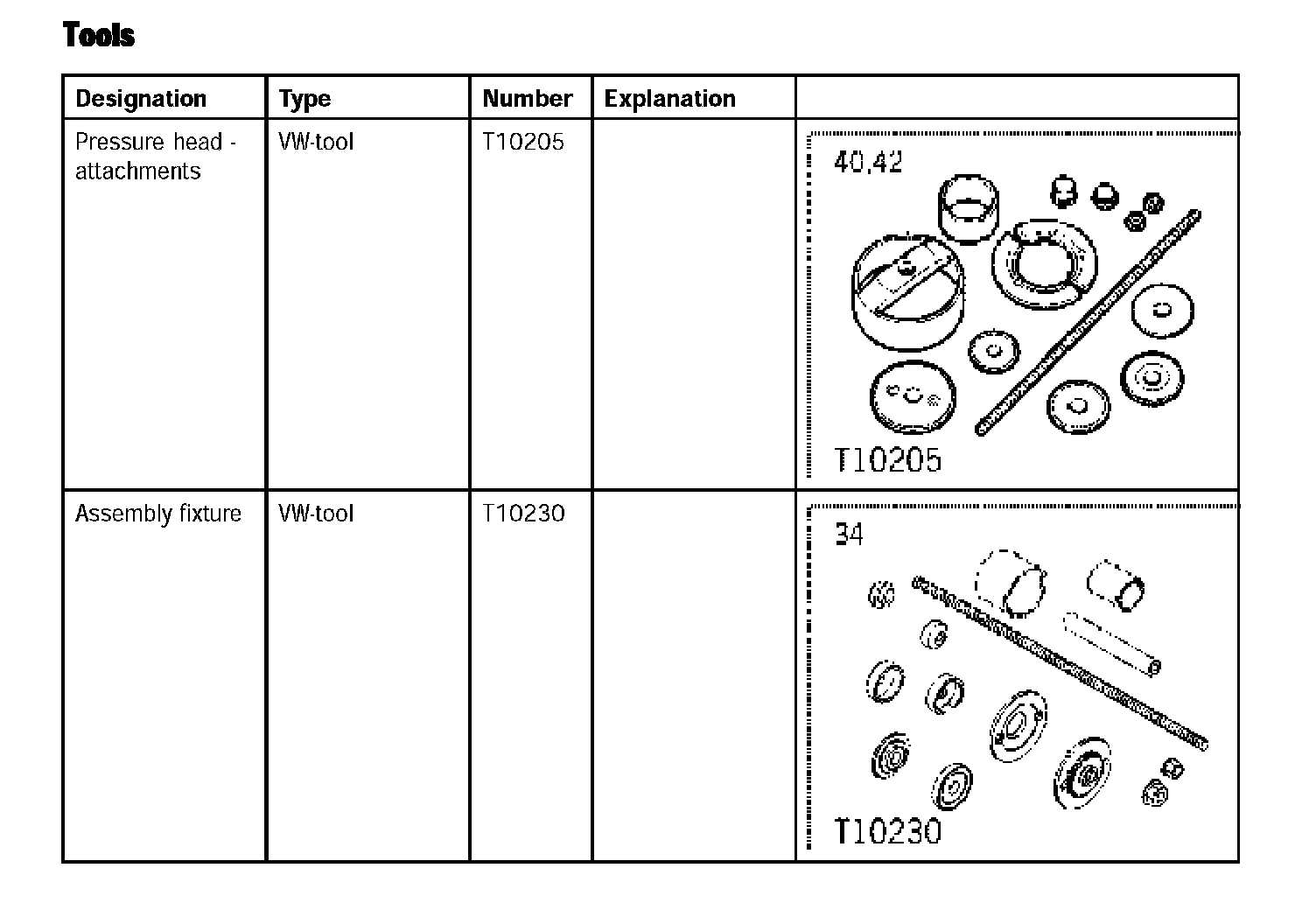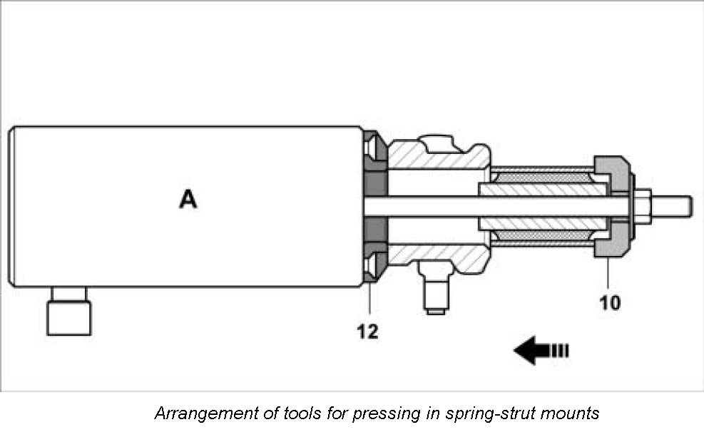 The pressure pieces are used as follows Arrangement of tools for pressing in spring-strut mounts.