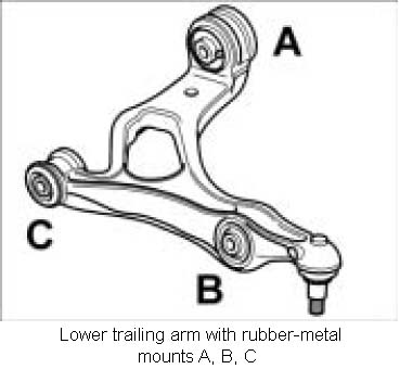 Lower trailing arm with rubber-metal mounts A, B, C.