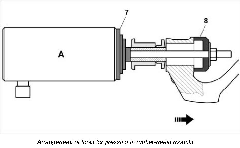 The pressure pieces are used as follows Arrangement of tools for pressing out rubber-metal mounts.