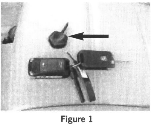 When the plastic "KESSY" key (Arrow in Figure 1) is used to start the vehicle, the battery underneath the driver's seat is utilized. When the main ignition key is used, the current from the auxiliary battery is used to start the engine. If the main battery (located underneath the driver's seat) is dead on a vehicle equipped with an auxiliary battery and KESSY, the plastic key must be removed from the ignition switch. The main ignition key must then be inserted in order to start the vehicle.