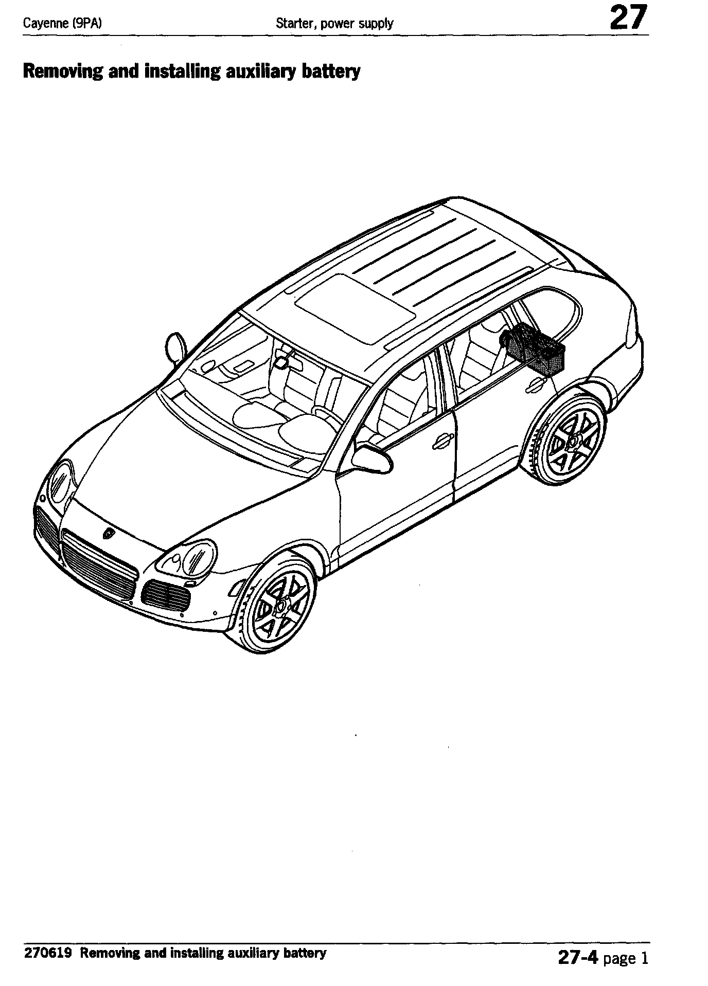 The Cayenne S and Cayenne Turbo vehicles are currently being delivered with an auxiliary battery. The auxiliary battery is used exclusively for starting the engine. A cutoff relay connects it to the vehicle electrical system when the engine is started and disconnects it when the engine is not running. The auxiliary battery is located in the spare-wheel well in the rear of the vehicle and is charged when the engine is running.