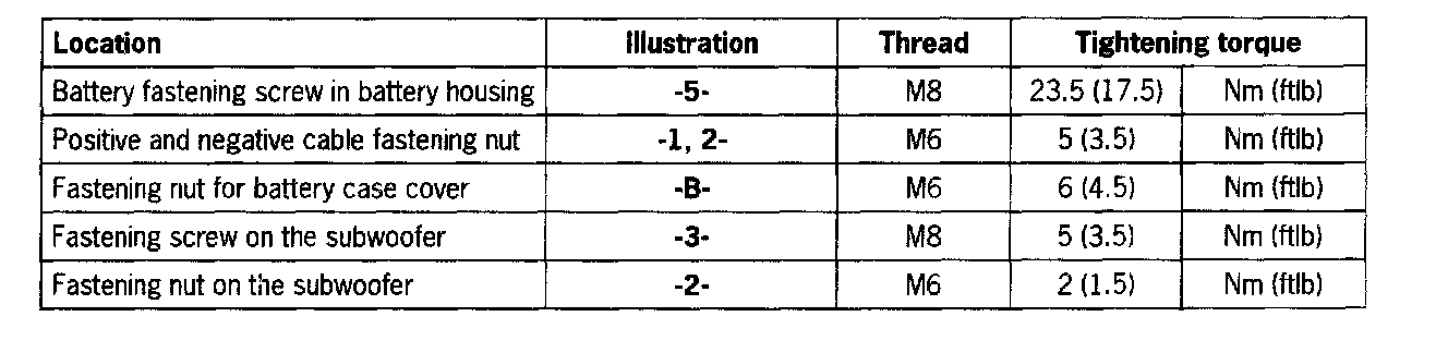 ^ If the vehicle contains a subwoofer or collapsible spare wheel, the relevant component must be removed before the auxiliary battery is removed