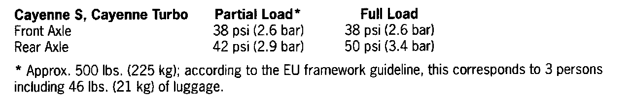 The specified tire pressures apply only to the tire types and makes approved by Porsche (including all of the winter, all-terrain, all-season and summer tire types) and are specified for cold tires approx. 68° F. (20° C.). These are minimum tire pressures and must always be observed, since in addition to the unfavorable driving performance, serious tire damage could be caused.