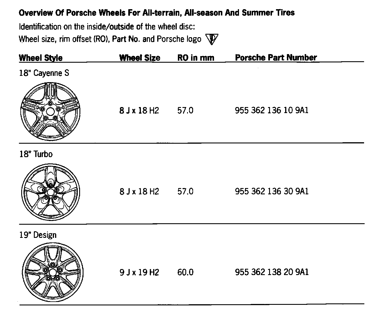 The wheels are secured with standard wheel bolts M 14 x 1.5 x 51, Part Number, 955 361 203 00. Tightening torque: 160 Nm (118 ftlb.).