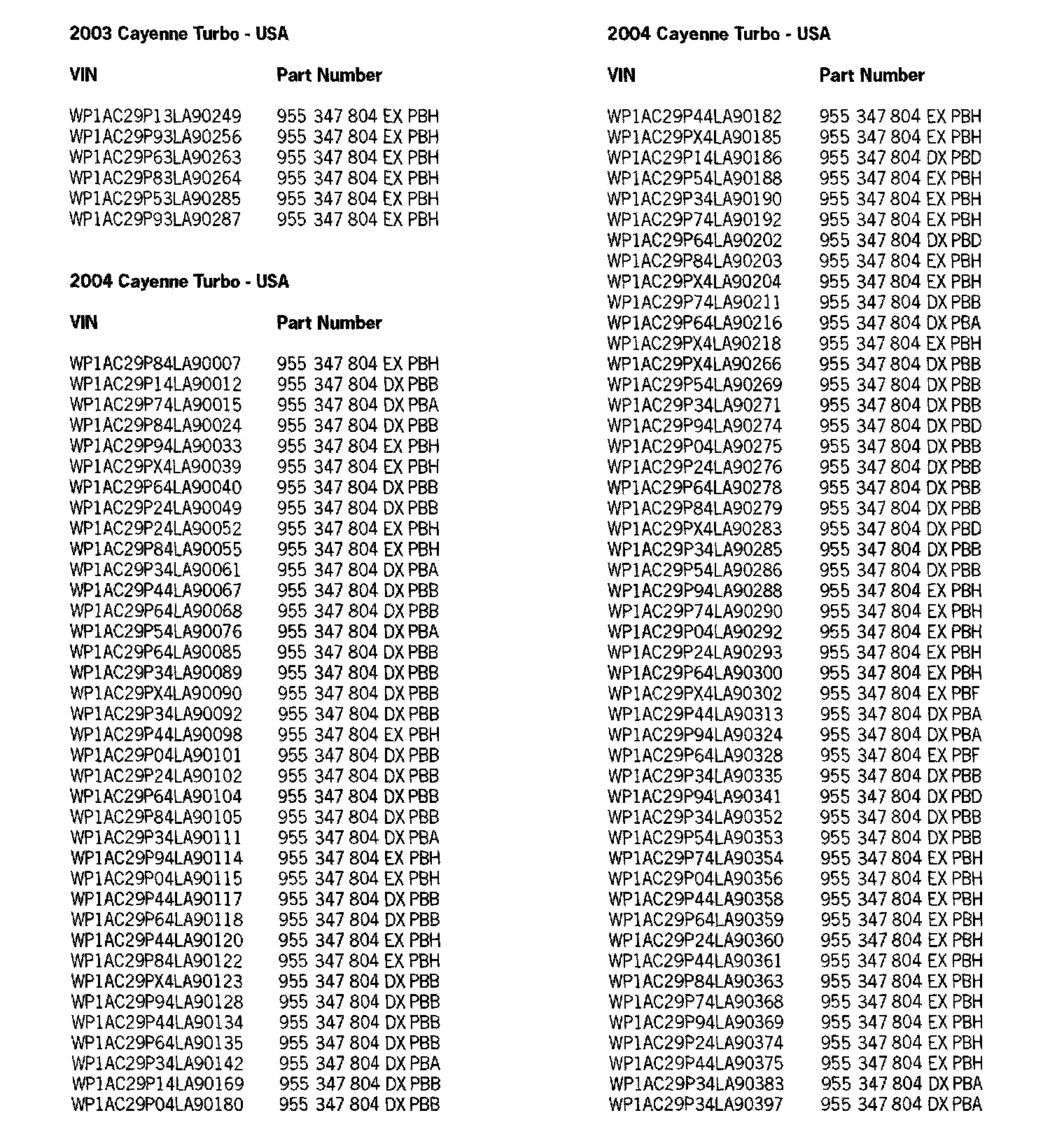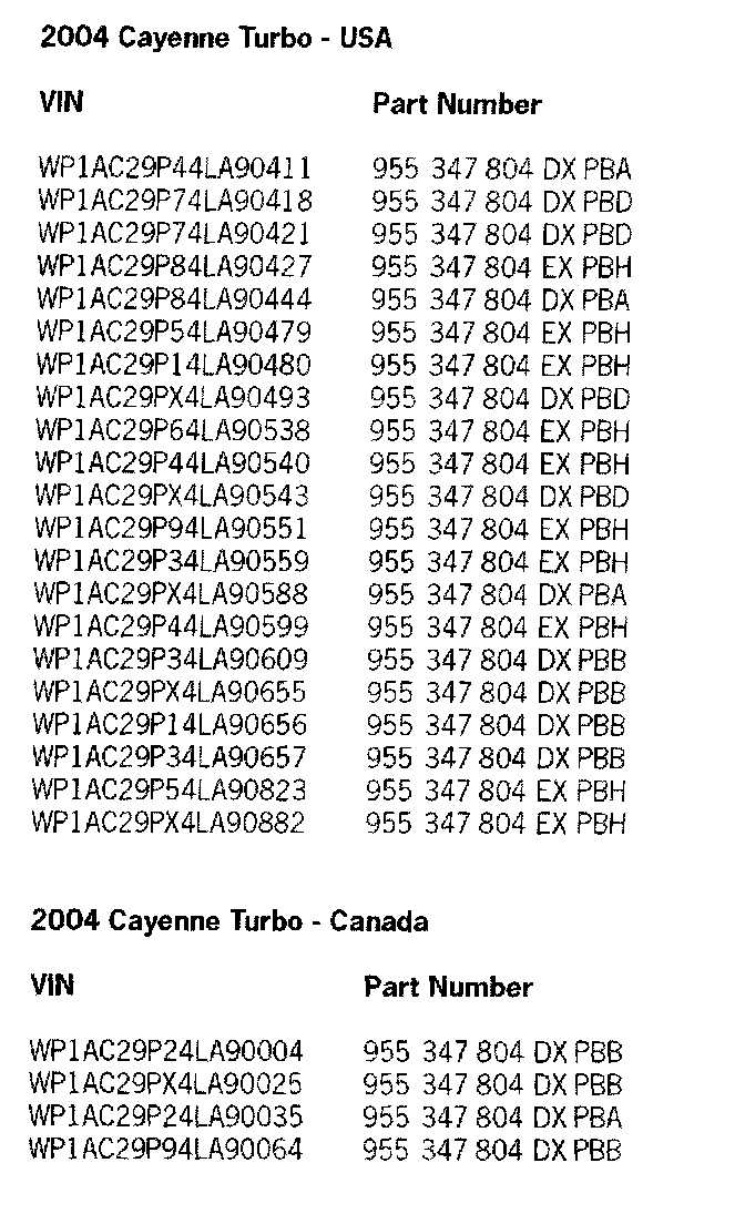 WP1AC29P13LA90249 to WP1AC29P93LA90287 Cayenne Turbo (U.S)