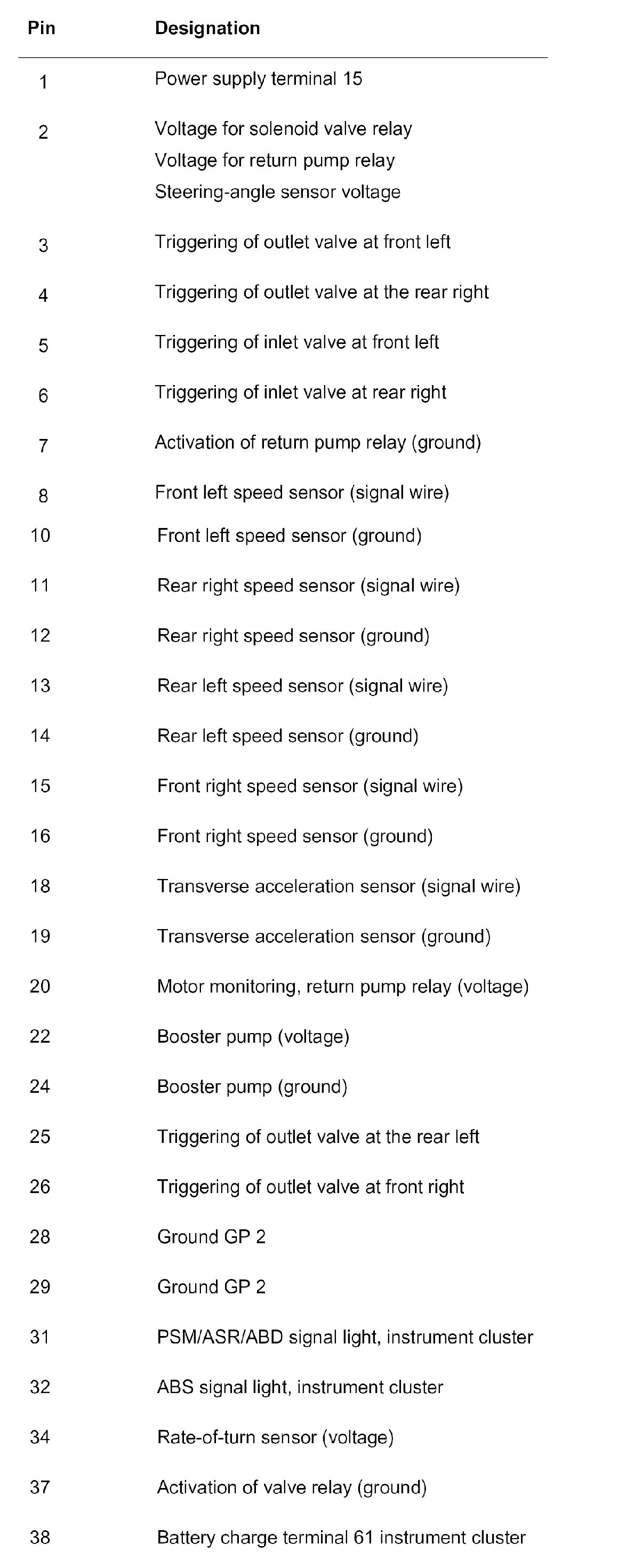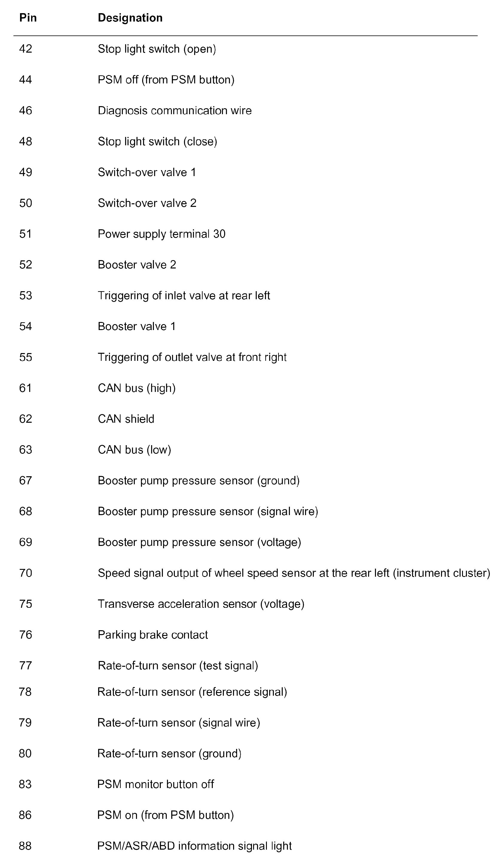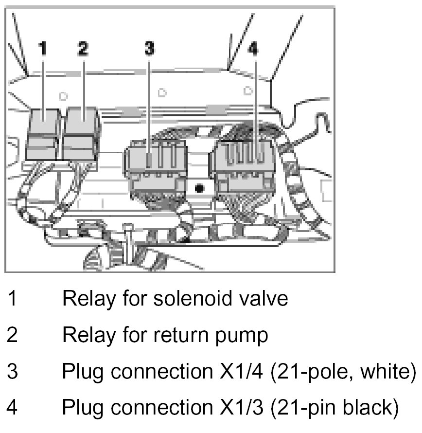 The plug connections X1/3, X1/4 and the solenoid valve and return pump relays are located in the passenger compartment wiring harness on the left at the front behind the PSM control module.