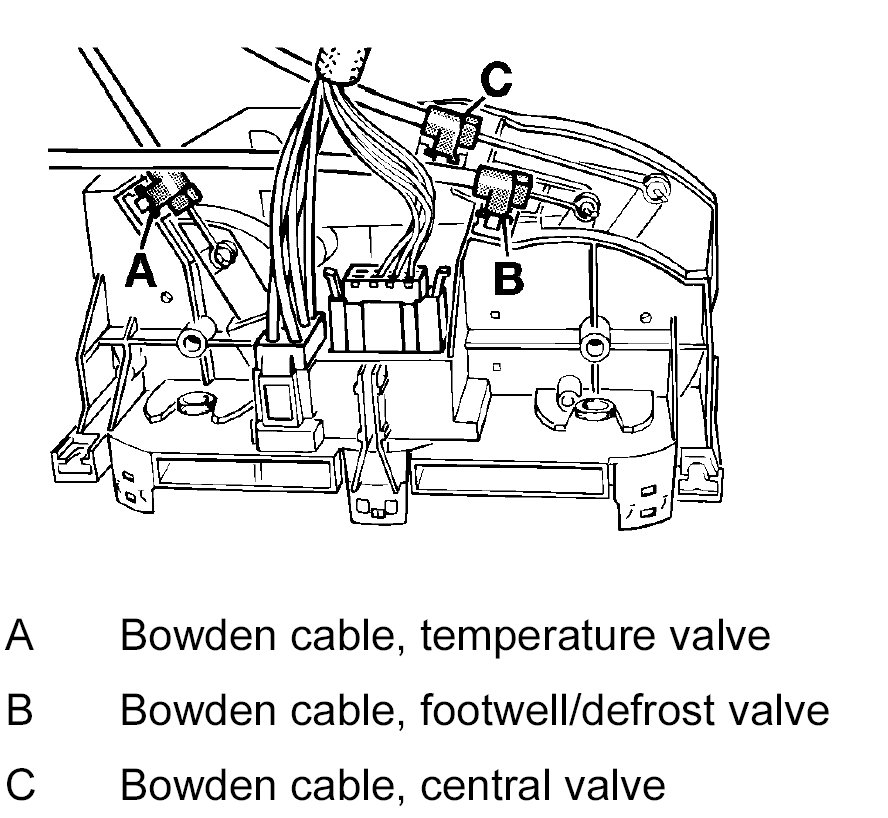 NOTE: Perform a function test after installing the bowden cables. Test limit position of the rotary knobs for air distribution and adjusting levers of the valves.