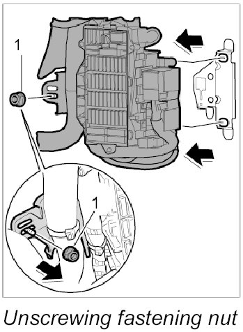 2. Unscrew the fastening nut -1-, pull the fuse box forward and disengage it from the support.