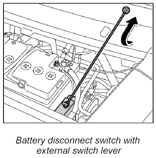 The battery disconnect switch, which is supplied via the positive terminal, is closed manually using the external switch lever and locked electromagnetically. The luggage compartment lid must not be open when doing this.