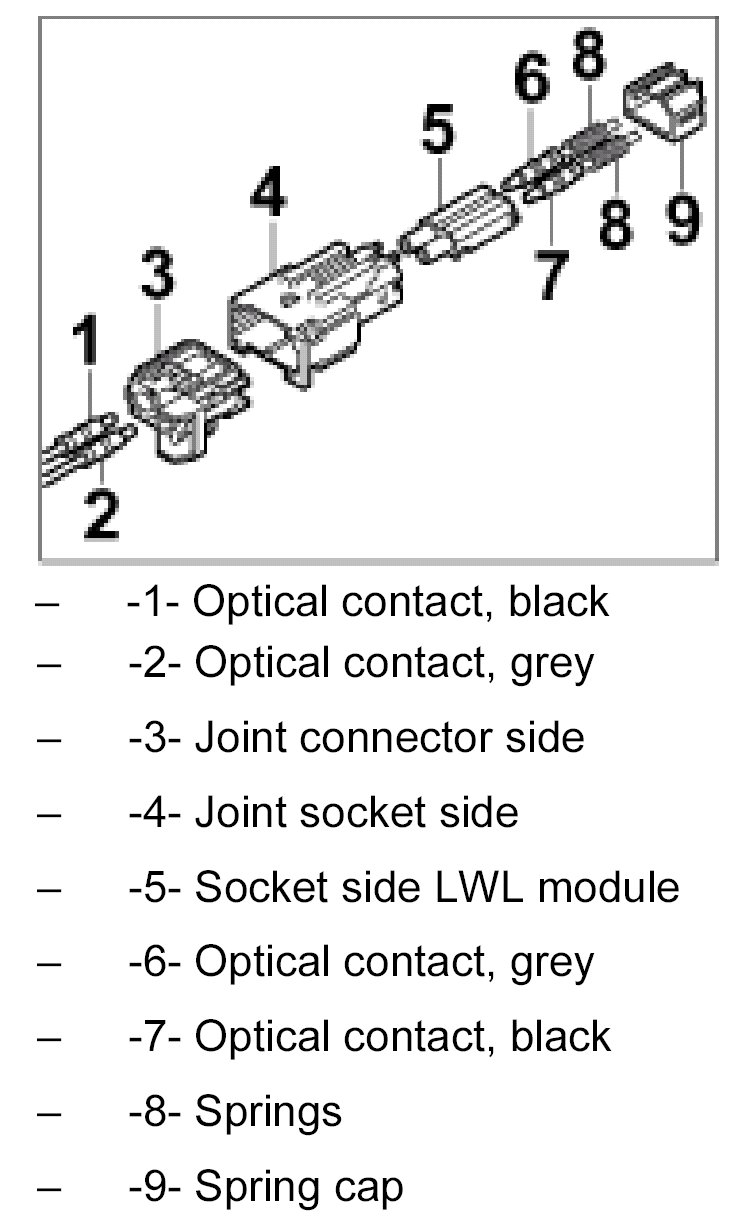 The LWL is delivered with affixed plastic contacts. These contacts are latched in the connector housing in the case of repairs. Grey and black contacts with identical mechanical dimensions are used.