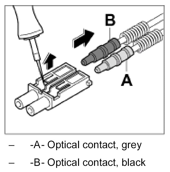 1. Insert the optical contacts -B- and -A- in the module until it engages audibly. Check the optical contacts for tightness.
