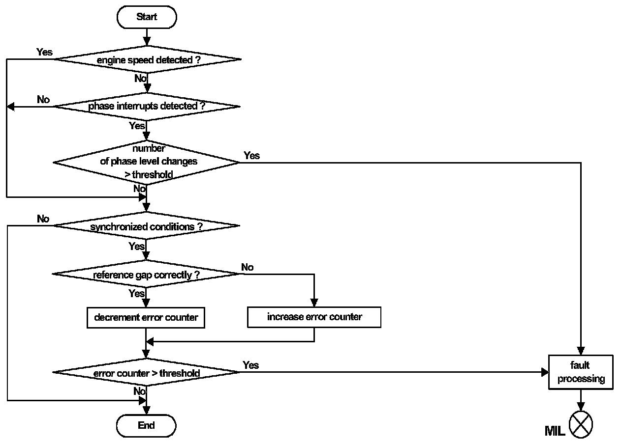 Under normal operating conditions, the flywheel position reference gap is monitored. At a loss of synchronization (more than one tooth difference between expected and observed gap position), the error counter is increased. If the gap is determined correctly the error counter is decreased. As soon as the error counter reaches a certain threshold an engine speed sensor malfunction is detected.