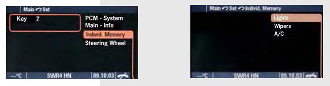 The individual memory allows extended vehicle settings to be made via PCM. These settings are individually assigned to the respective ignition key. Each time the key is inserted in the ignition lock, the stored settings are automatically activated via PCM.