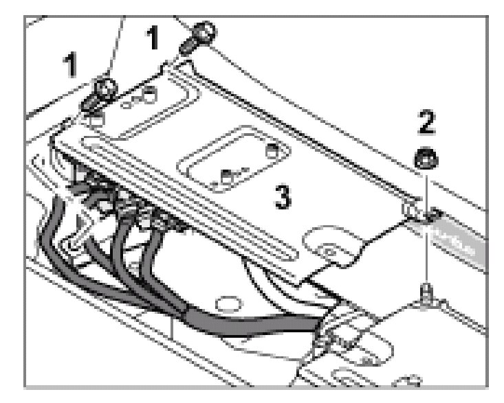 4. Turn the control module holder -3- and push it in under the fastening nut -2-. Tighten both fastening screws -1- and the fastening nut -2-. Tightening torque: 10 Nm (7.5 ft.lb.)