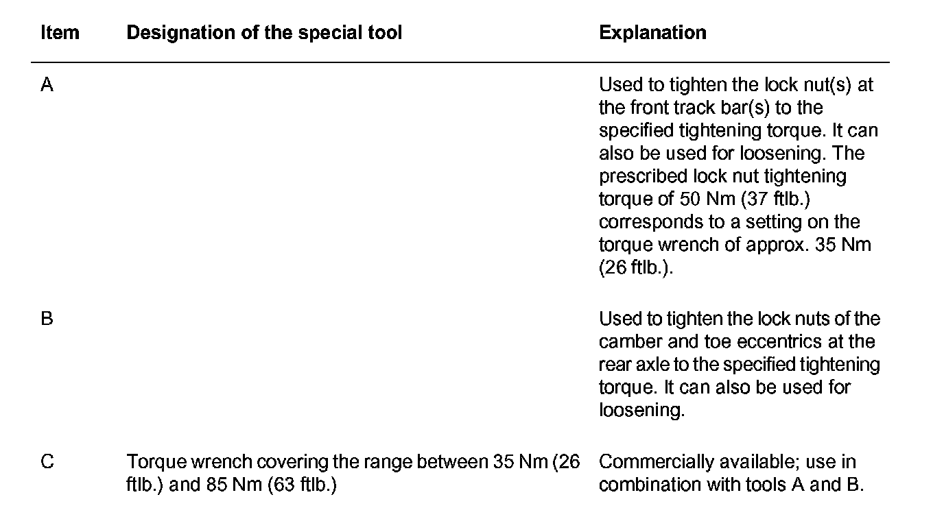 ^ The prescribed lock nut tightening torque of 50 Nm (37 ft. lbs.) corresponds to a setting on the torque wrench of approximately 35 Nm (26 ft. lbs.)!