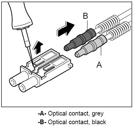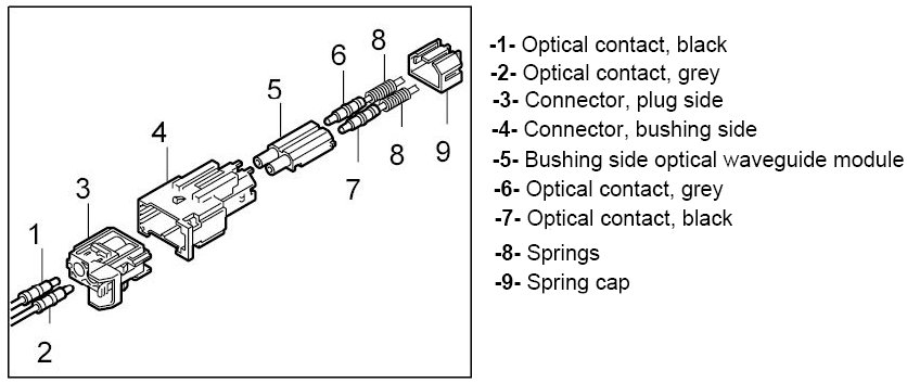 The optical waveguide is delivered with plastic contacts affixed. In case of repairs, these contacts are engaged in the connector housing. Grey and black contacts with identical mechanical dimensions are used.