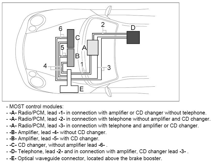 The graphic below shows the wiring of the individual MOST control modules which varies according to the particular equipment.