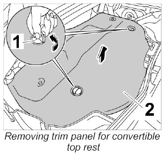 1. Twist the turn-lock fasteners -1- in -direction of arrow- and lift trim panel for convertible top rest -2- up and off.