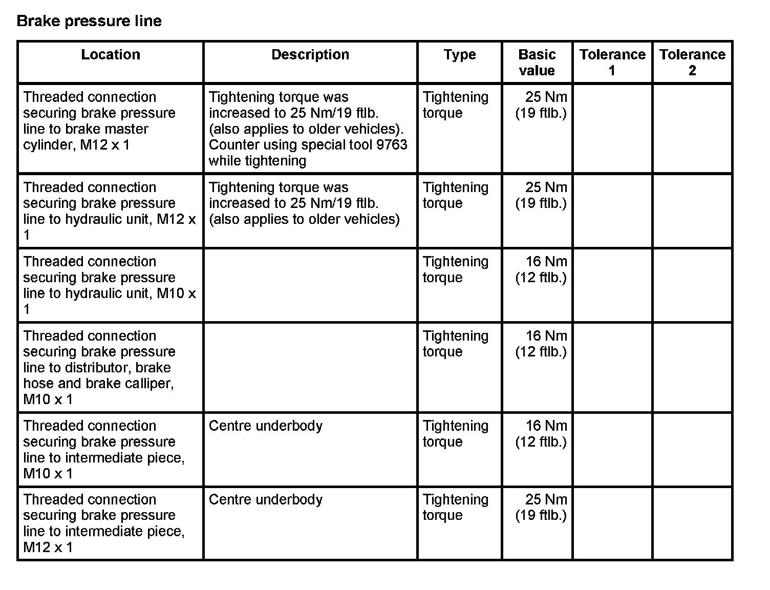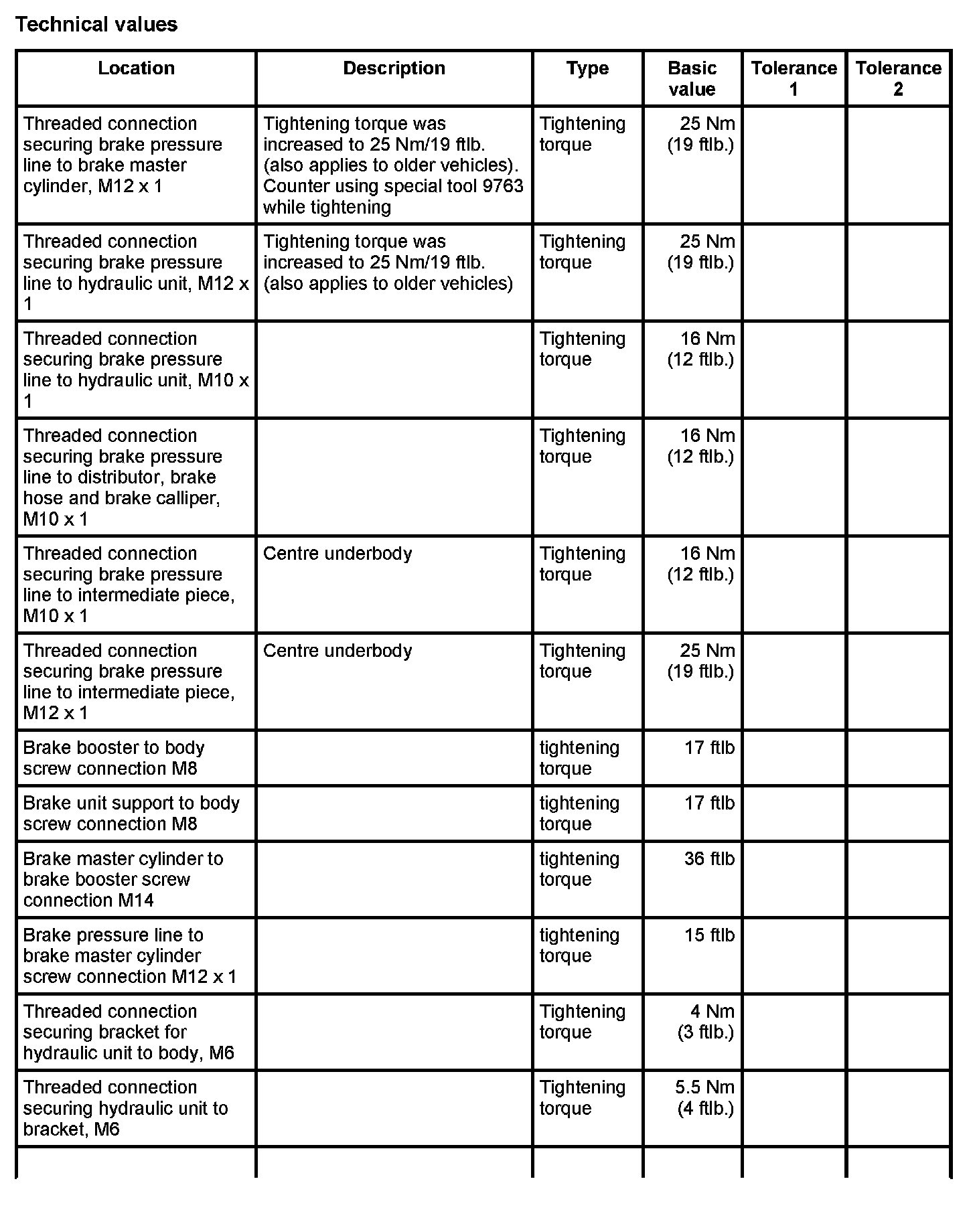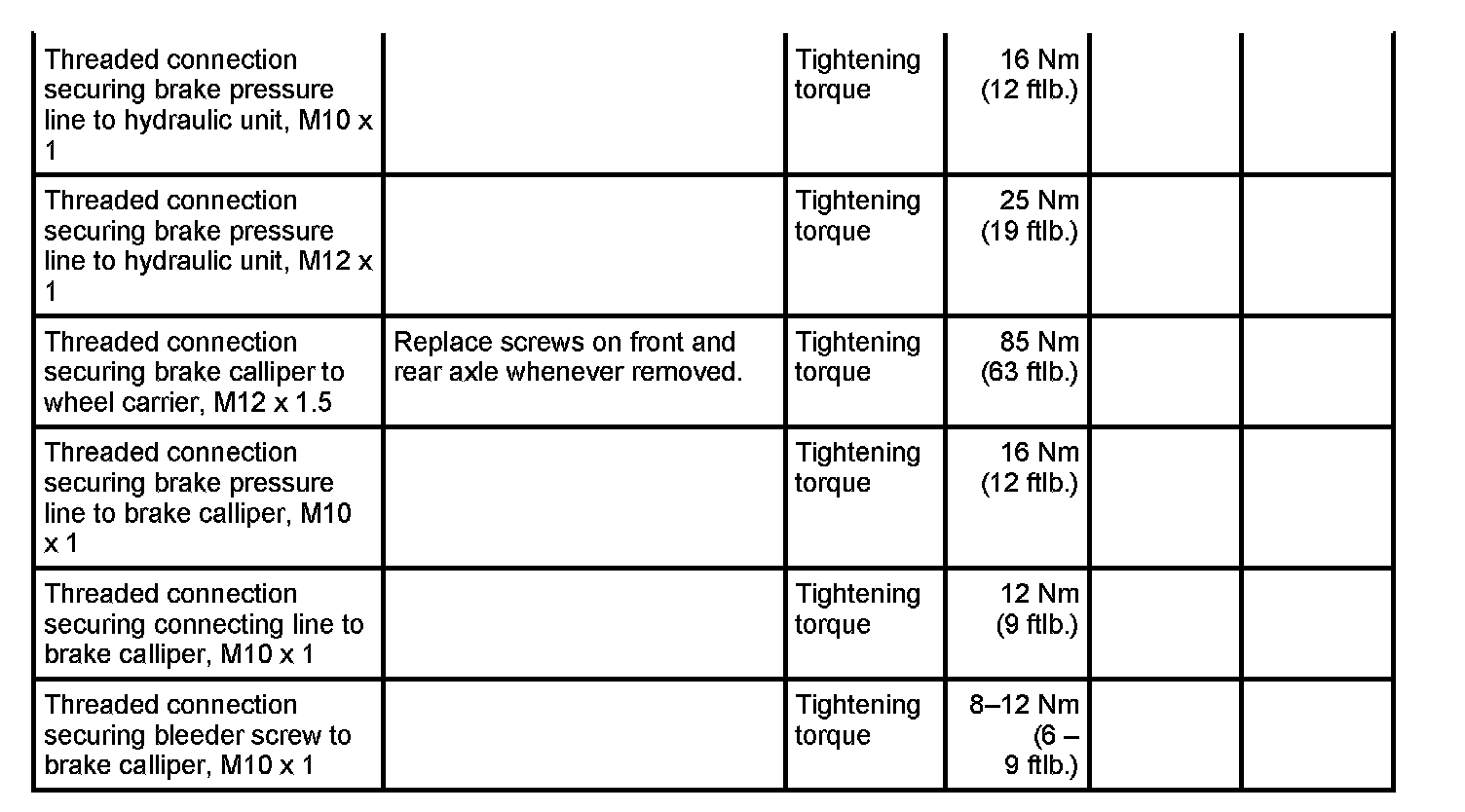 WM 4700TW Tightening torques for brake hydraulics