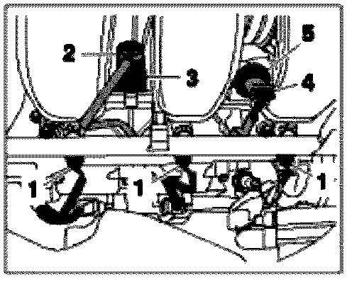 37. Remove engine mountings by unscrewing the three hexagon-head bolts (M10 x 120) and the hexagon-head bolt (M10 x 80). Only the left upper hexagon-head bolt (M10 x 120) can be loosened. The hexagon-head bolt cannot be unscrewed until the engine mounting has been removed.