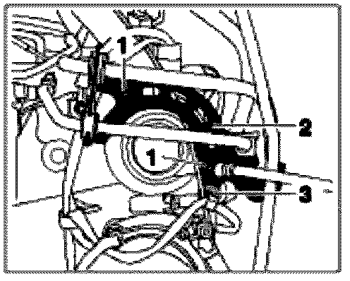 3. Remove pulley -2- of power-steering pump; to do this, counter the pulley -2- as shown using a screwdriver, then loosen and remove the three Torx screws (M8 x 12) -1 -.